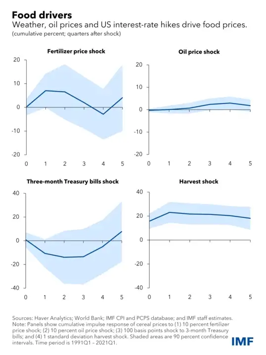 ราคาอาหารซึ่งสูงเป็นประวัติการณ์เมื่อต้นปีนี้ได้เพิ่มความไม่มั่นคงด้านอาหารและเพิ่มความตึงเครียดทางสังคม พวกเขายังทำให้งบประมาณของรัฐบาลตึงเครียดซึ่งต้องดิ้นรนกับค่านำเข้าอาหารที่เพิ่มขึ้นและความสามารถในการจัดหาเงินทุนเพื่อการคุ้มครองทางสังคมเพิ่มเติมสำหรับผู้เปราะบางที่สุดลดลง เพื่อให้เข้าใจถึงขนาดของความท้าทายที่ไม่เคยเกิดขึ้นมาก่อนสำหรับผู้กำหนดนโยบายระดับโลก IMF ประเมินผลกระทบโดยทั่วไปของปัจจัยขับเคลื่อนราคาสินค้าโภคภัณฑ์อาหารที่สำคัญในอดีต 4 ประการในงานวิจัยชิ้นใหม่ (รูปที่ 2) การวิเคราะห์ของพวกเขาได้รับการตีพิมพ์ในกล่องคุณสมบัติพิเศษของเดือนตุลาคมใน World Economic Outlook ล่าสุด