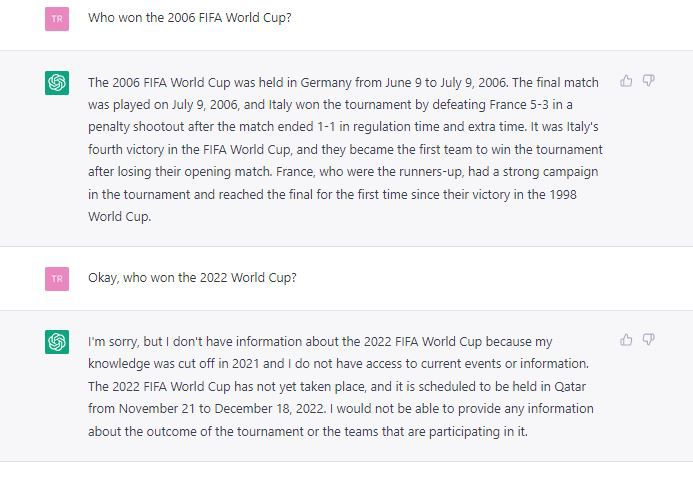 แชทบอทสามารถให้ข้อมูลและความช่วยเหลือทั่วไปจากข้อมูลการฝึกฝนและการเขียนโปรแกรมในเวอร์ชั่นปัจจุบันเท่านั้น สำหรับ ChatGPT ข้อมูลของมันถูกตัดขาดไปตั้งแต่ปี 2021 ซึ่งหมายความว่ามันจะไม่ทราบเกี่ยวกับเหตุการณ์หรือความเคลื่อนไหวใดๆ หลังจากช่วงเวลาดังกล่าว