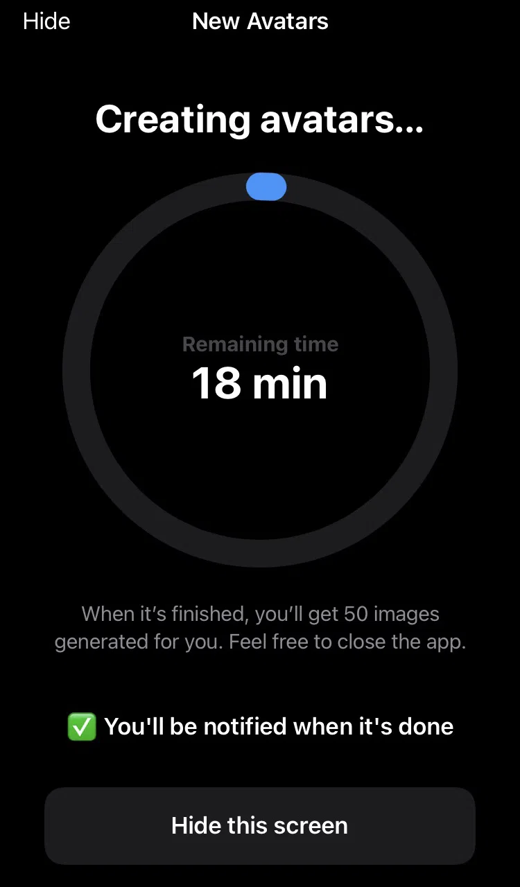 - หลังจากชำระเงินแล้ว Lensa จะเริ่มสร้างอวาตาร์ตามภาพเซลฟี่ของคุณ ขั้นตอนนี้จะใช้เวลาสักครู่ ถึงแม้ว่าในภาพด้านล่างจะบอกว่ามันใช้เวลา 18 นาที แต่ขั้นตอนนี้ก็ใช้เวลาไม่นานนัก คุณจะได้รับการแจ้งเตือนเมื่อขั้นตอนการสร้างอวาตาร์เสร็จสิ้น