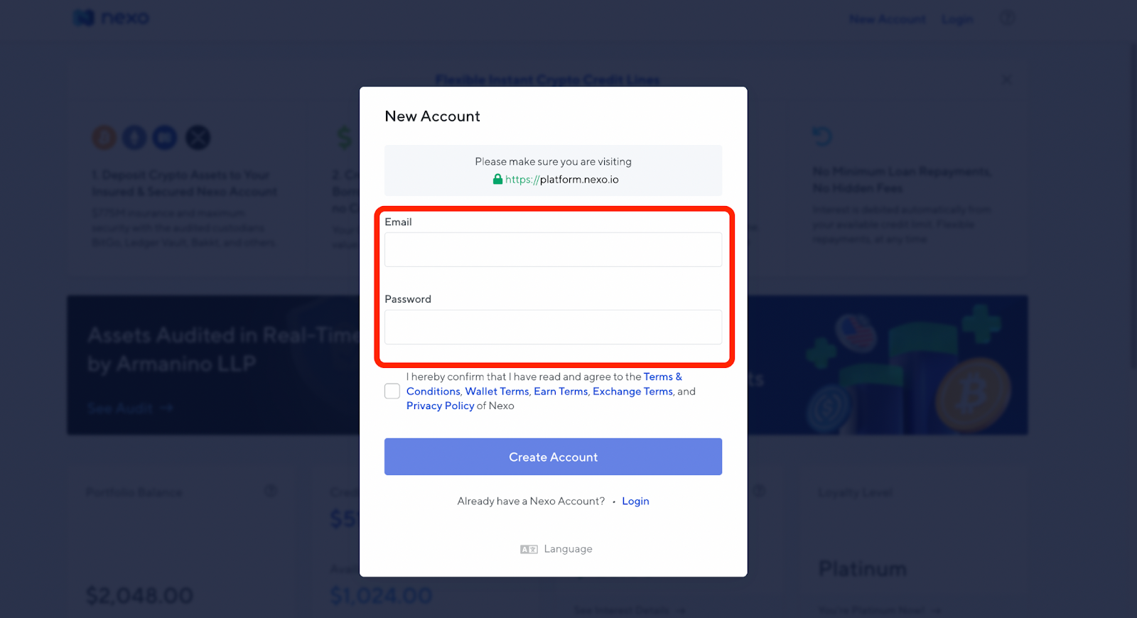 ไปที่ https://platform.nexo.io/ และกรอกข้อมูลของคุณ