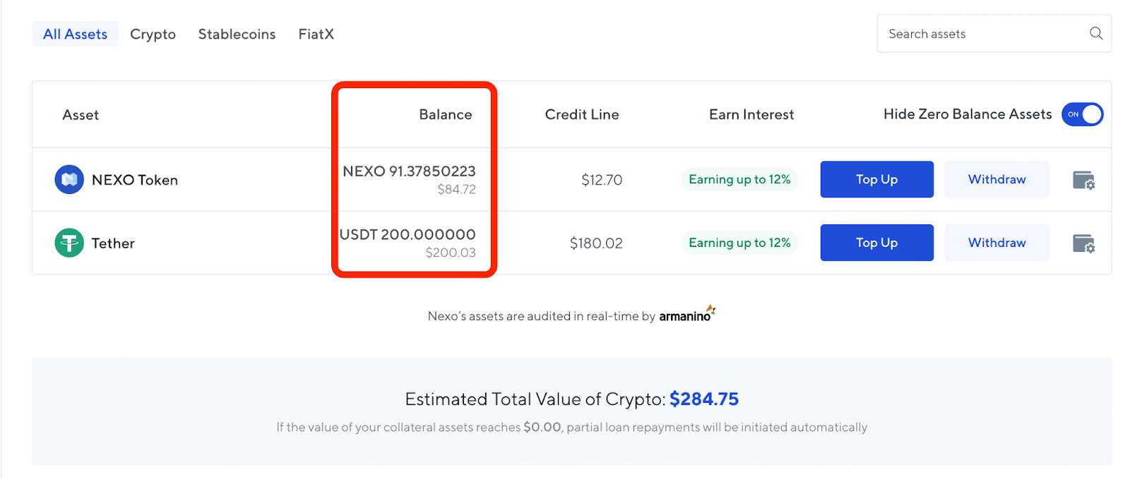 เปิดสวิตช์ “Hide Zero Balance Assets” เพื่อดูเฉพาะสินทรัพย์ที่ฝากเอาไว้