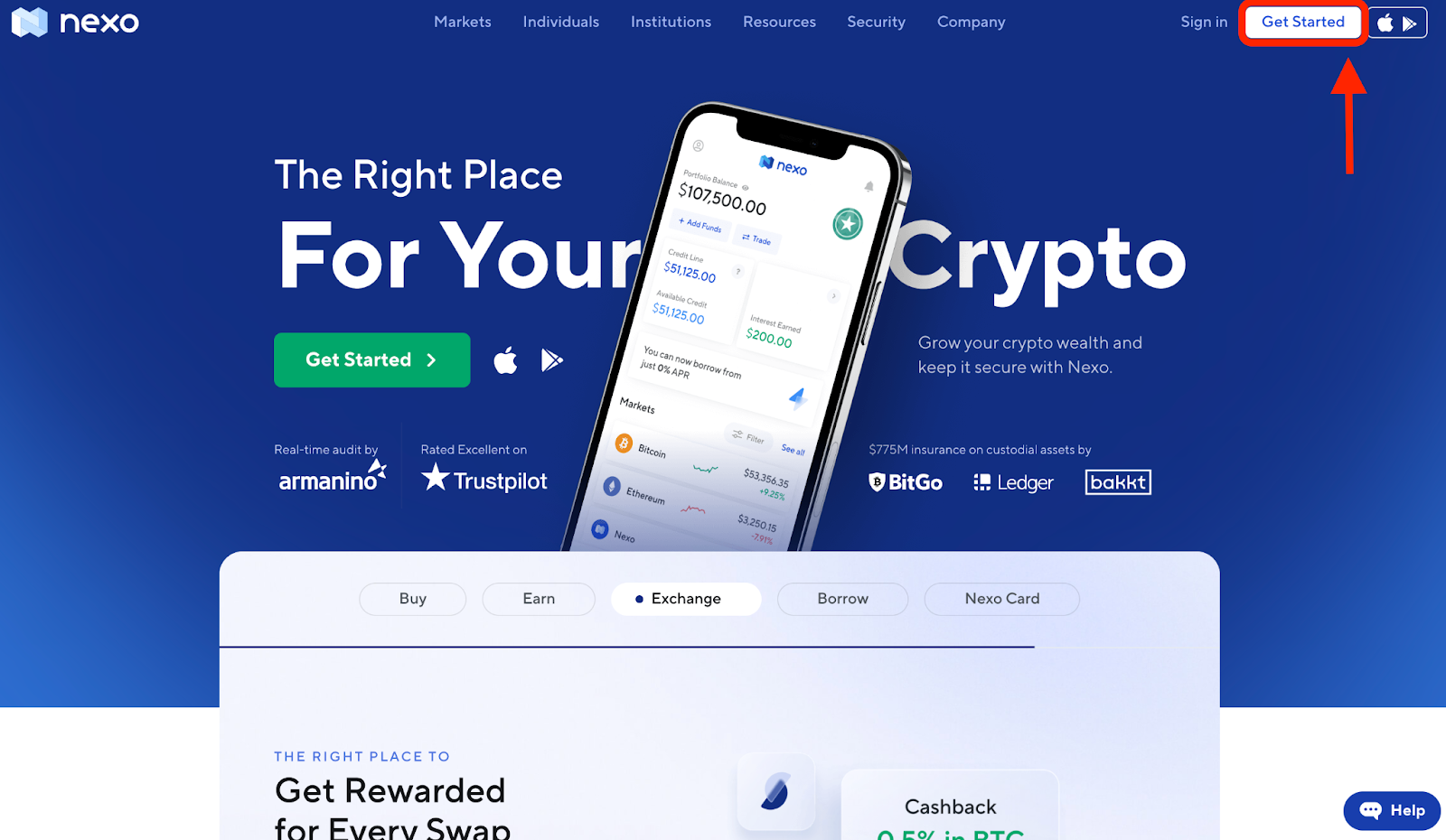 เปิด https://nexo.io/ และคลิกที่ “Get Started”