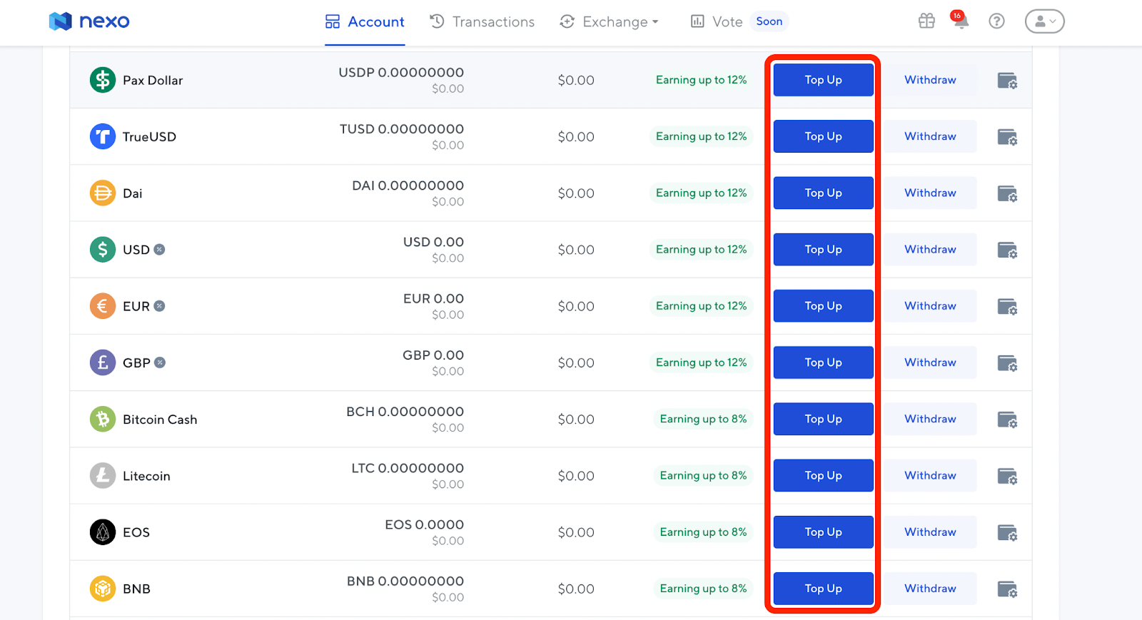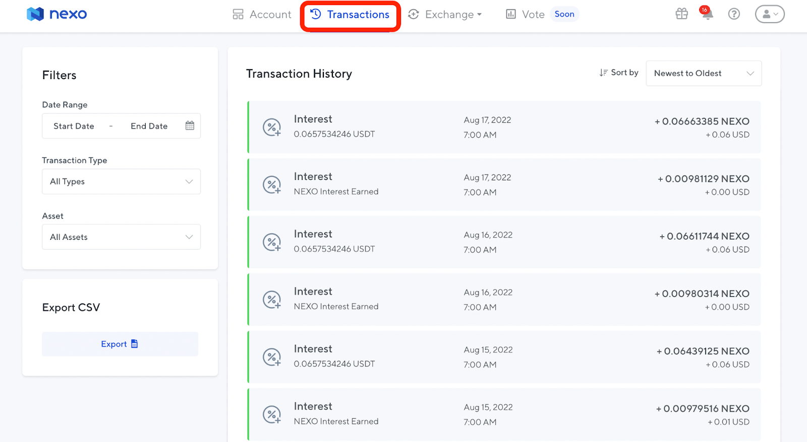 คุณจะสามารถดูเงินฝากและธุรกรรมทั้งหมดได้ภายใต้แท็บ “Transactions” ที่นี่คุณจะพบกับดอกเบี้ยรายวันที่จ่ายให้กับเงินฝากของคุณ