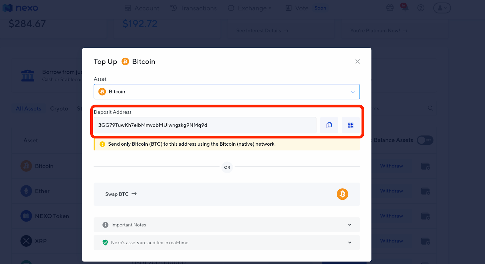 คุณจะได้รับที่อยู่เงินฝากสำหรับสินทรัพย์นั้นๆ ซึ่งมีรายละเอียดทั้งหมดที่กล่าวถึงการฝากเงิน แพลตฟอร์มไม่รองรับ Wrapped Tokens นอกจากนี้ คุณจะต้องระบุเครือข่ายการฝากเงินด้วย
