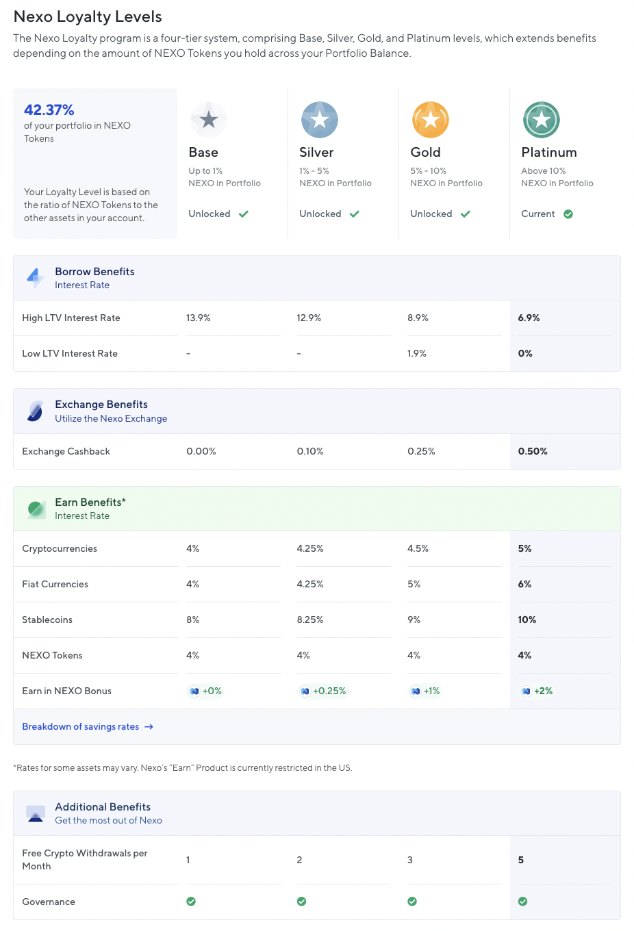 เพื่อที่จะได้ APY สูงสุดสำหรับสินทรัพย์แต่ละตัว คุณต้องถือโทเค็น NEXO 10% ของมูลค่ารวมของกระเป๋าเงินในบัญชีของคุณ สิ่งเหล่านี้เรียกว่า Loyalty Level และยังส่งผลต่ออัตราการกู้ยืมของคุณและเสนอผลประโยชน์ให้ในกระดานเทรด