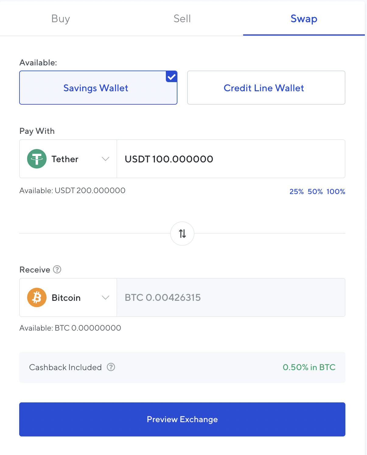 คุณสามารถเพิ่ม Visa หรือ Mastercard ของคุณลงในแอพและกรอกจำนวนสินทรัพย์ที่ต้องการ หากคุณเป็นเจ้าของสินทรัพย์อื่นๆ บนแพลตฟอร์มอยู่แล้ว คุณอาจจะเลือกที่จะแลกมันกับ BTC ได้ เพื่อที่จะทำเช่นนั้น ให้เลือกตัวเลือก “Swap” เลือกสินทรัพย์ที่จะชำระ จำนวนเงิน และสินทรัพย์ที่จะได้รับ