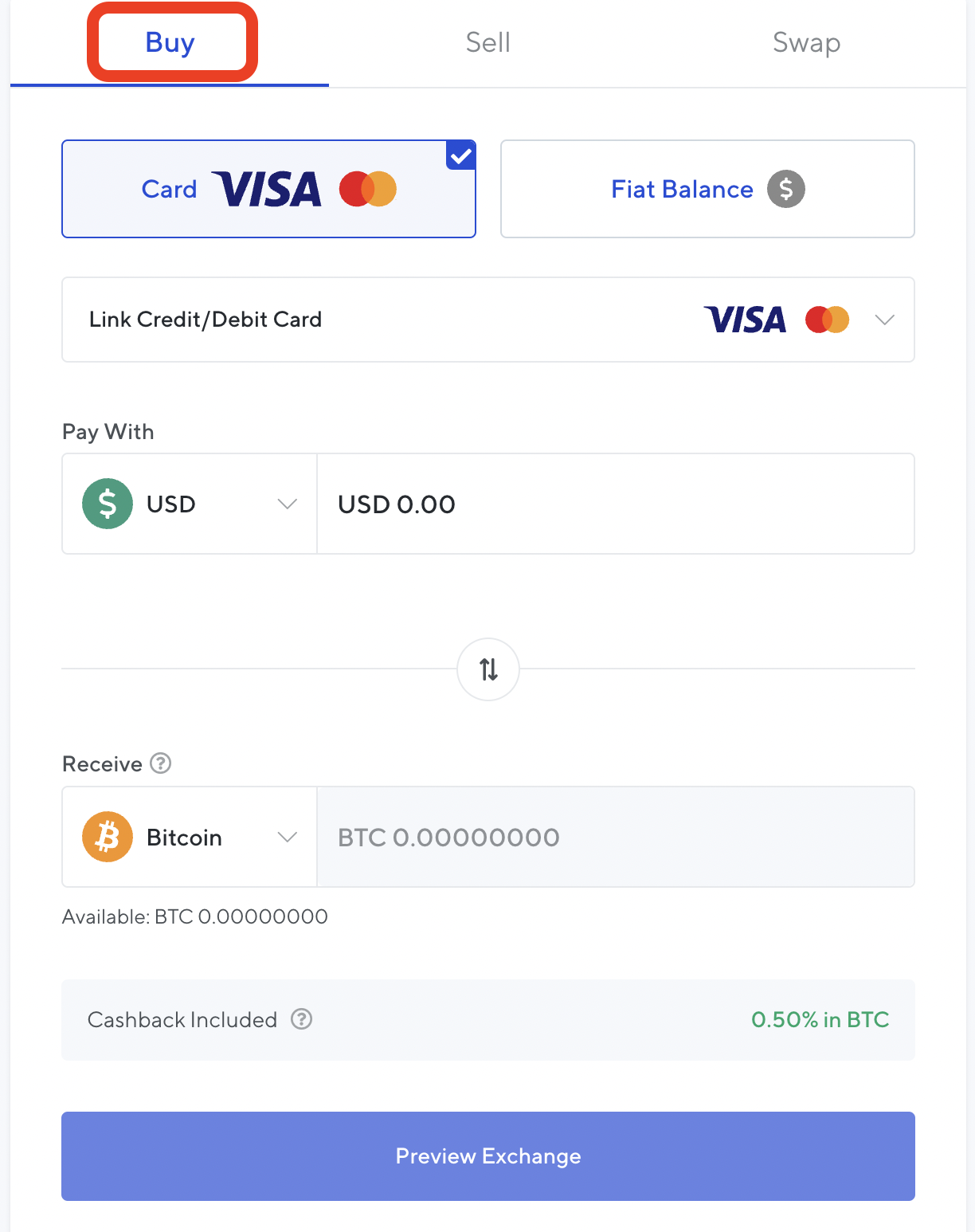อย่างไรก็ตาม หากคุณไม่ได้เป็นเจ้าของ Cryptocurrency ใดๆ คุณสามารถคลิกที่ “Swap BTC” (หรือสินทรัพย์อื่นที่คุณต้องการฝาก) และคุณจะสามารถซื้อมันได้โดยตรงด้วยบัตรเครดิตหรือบัตรเดบิตของคุณ