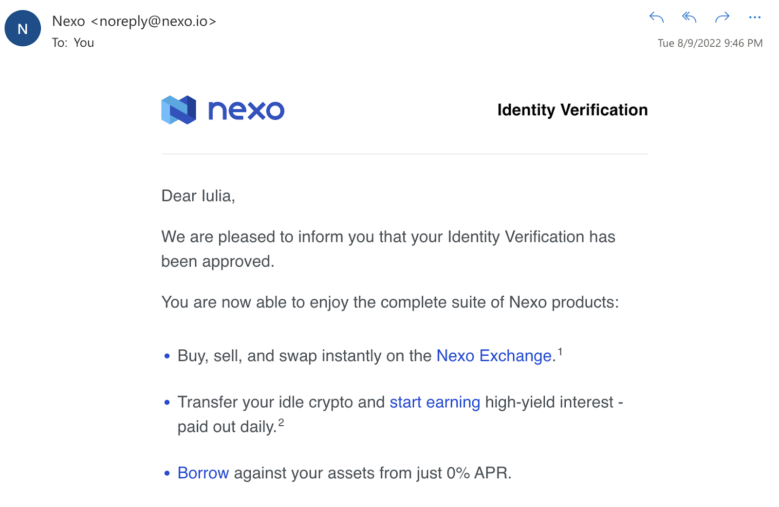 หลังจากที่อีเมลของคุณได้รับการยืนยันแล้ว คุณจะสามารถเข้าสู่ระบบและสำรวจฟีเจอร์ต่างๆ ของ Nexo ได้ อย่างไรก็ตาม ในการเริ่มต้นใช้งานแพลตฟอร์ม คุณจะต้องยืนยันตัวตนของคุณด้วย