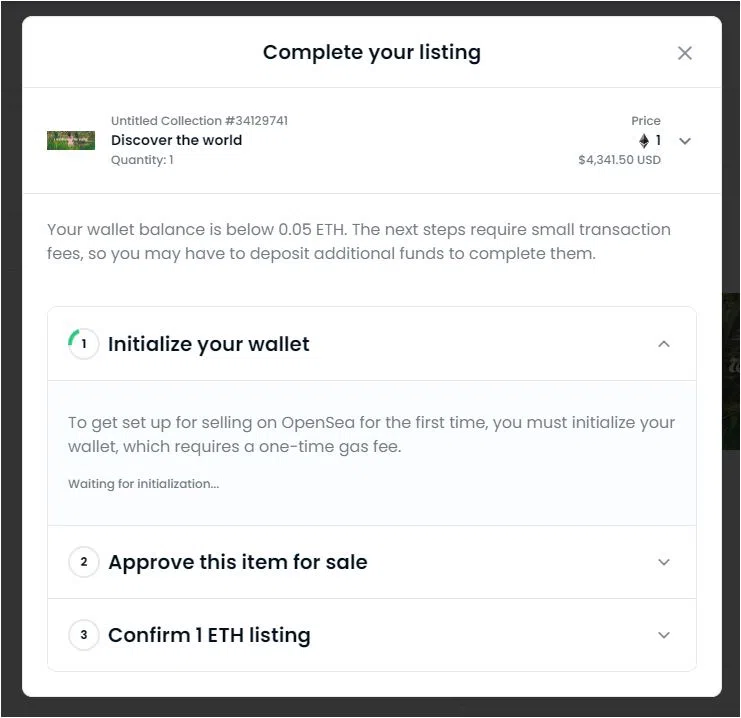 นี่คือสิ่งที่ดูเหมือนว่าจะทำให้รายการขาย NFT ของคุณสมบูรณ์ อย่างที่คุณเห็นแพลตฟอร์มจะขอค่าธรรมเนียมแก๊สแบบครั้งเดียวเพื่อเริ่มต้นกระเป๋าเงินของคุณ