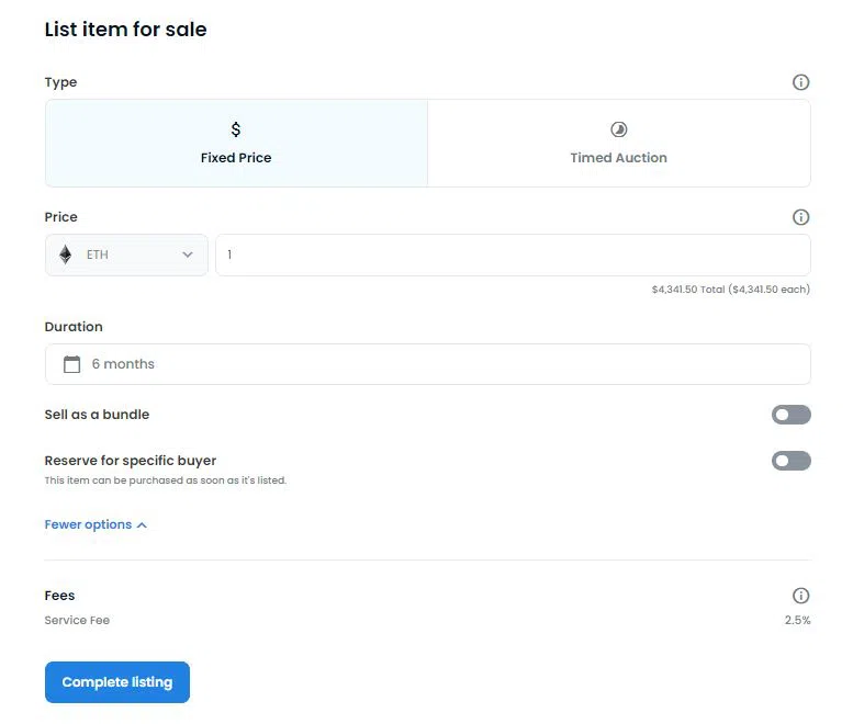 Sponsored Sponsoredยินดีด้วย! คุณสร้าง NFT สำเร็จแล้วและสามารถขายมันได้ใน OpenSea คุณสามารถเลือกได้ว่าต้องการรับโทเค็น Ethereum ใดเป็นการชำระเงิน นอกจากนี้คุณยังสามารถเลือกขายในการประมูลหรือราคาคงที่ได้อีกด้วย หน้าการขายจะช่วยให้คุณตัดสินใจเกี่ยวกับค่าลิขสิทธิ์ แม้ว่าการสร้าง NFT บน OpenSea นั้นฟรีแต่การลงขายจะต้องเสียค่าบริการ 2.5%