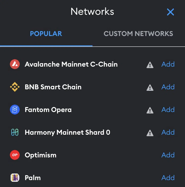- หาก Metis ไม่ได้อยู่ในรายการเริ่มต้นที่ MetaMask ให้ไว้ ให้แตะแท็บที่ระบุว่า “Custom Networks”