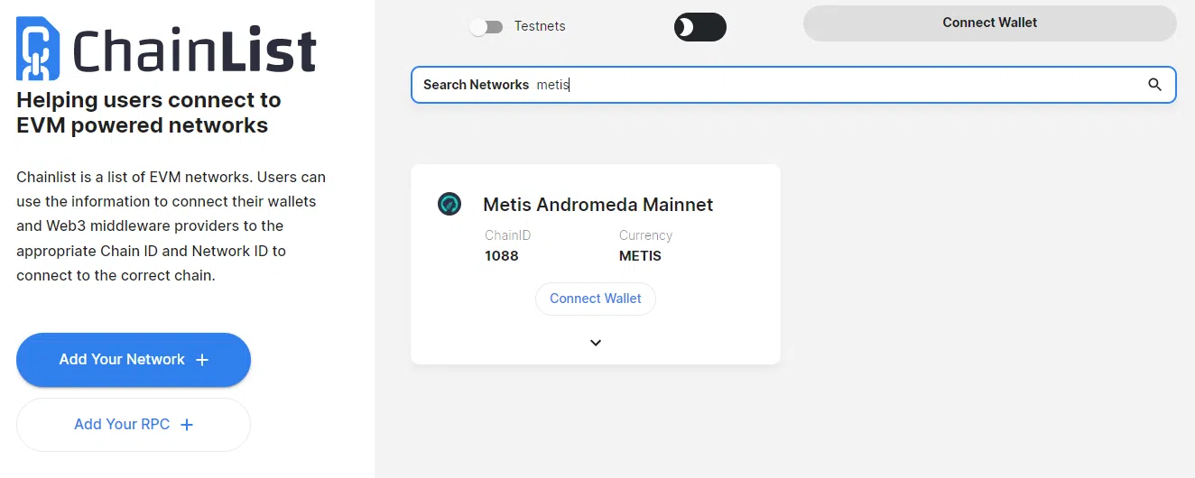Chainlist จะแสดงรายชื่อเครือข่าย EVM เช่น Metis และ Ethereum L2 อื่นๆ หากต้องการใช้ตัวเลือกนี้ ให้ทำตามขั้นตอนเหล่านี้: