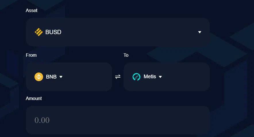 - จากนั้น เลือกสินทรัพย์ที่คุณต้องการโอนย้ายจากเมนูแบบดรอปดาวน์ เลือก BNB ในหัวข้อ “From” และ Metis ในหัวข้อ “To”