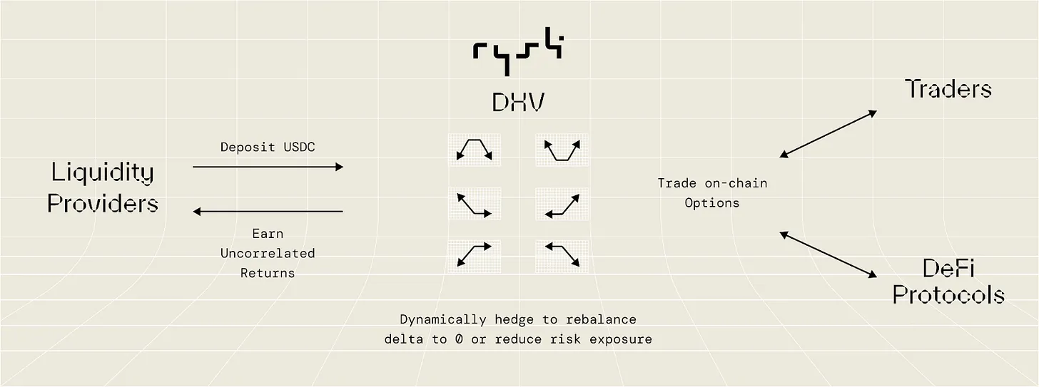 Rysk เป็นโปรโตคอลตัวเลือก DeFi แบบ on-chain ผลิตภัณฑ์แรกของ Rysk คือ DHV (Dynamic Hedging Vault) ซึ่งเป็นตัวเลือก AMM ใหม่ล่าสุด ซึ่งสร้างผลตอบแทนที่ไม่สัมพันธ์กันสำหรับผู้ให้บริการสภาพคล่องด้วยตัวเลือกการซื้อขายในขณะที่กำหนดเป้าหมายที่เป็นกลางของเดลต้า