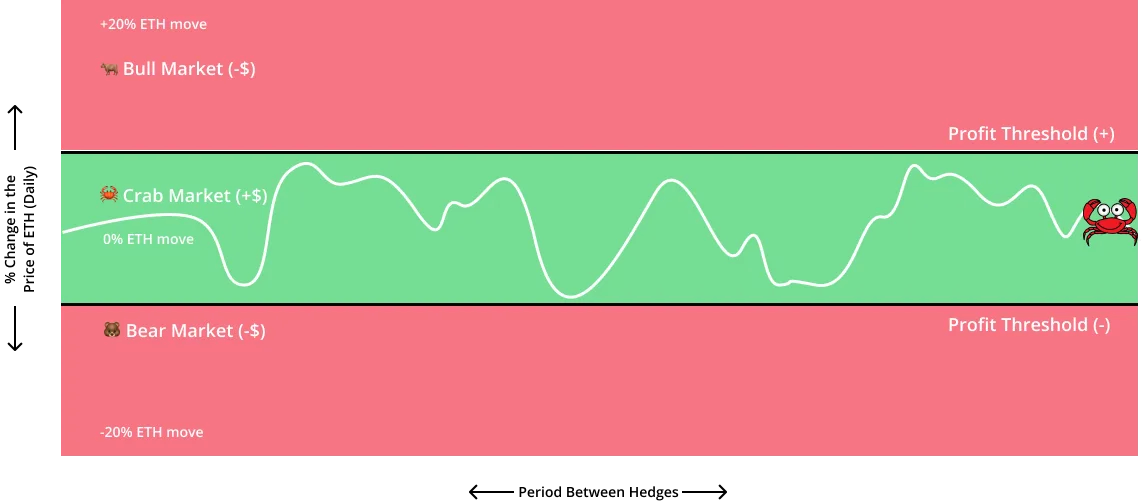 ดังนั้น สภาพตลาดในอุดมคติในการปรับใช้ Crab Strategy คือเมื่อราคาของ ETH ไม่ขยับขึ้นหรือลงมากเกินไประหว่างการปรับสมดุล