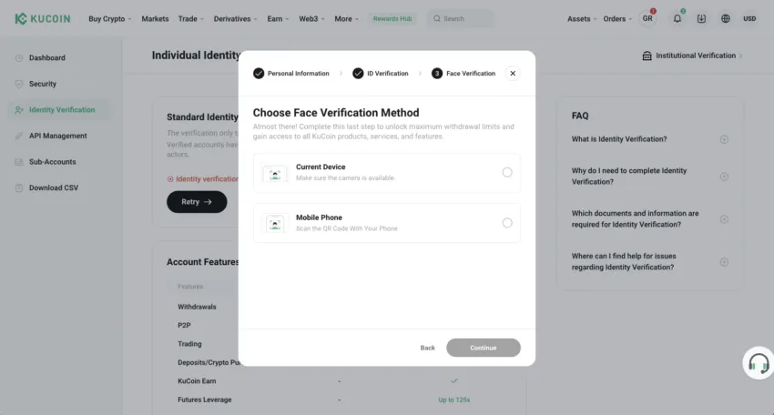 3. ทำการยืนยันใบหน้าให้เสร็จเรียบร้อย: หลังจากอัพโหลดรูปภาพของคุณแล้ว ให้คลิกที่ “Continue” เพื่อเริ่มการยืนยันใบหน้า เลือกอุปกรณ์ของคุณ จากนั้น ปฏิบัติตามคำแนะนำเพื่อเสร็จสิ้นกระบวนการ ระบบจะทำการส่งข้อมูลของคุณให้ทำการตรวจสอบโดยอัตโนมัติ