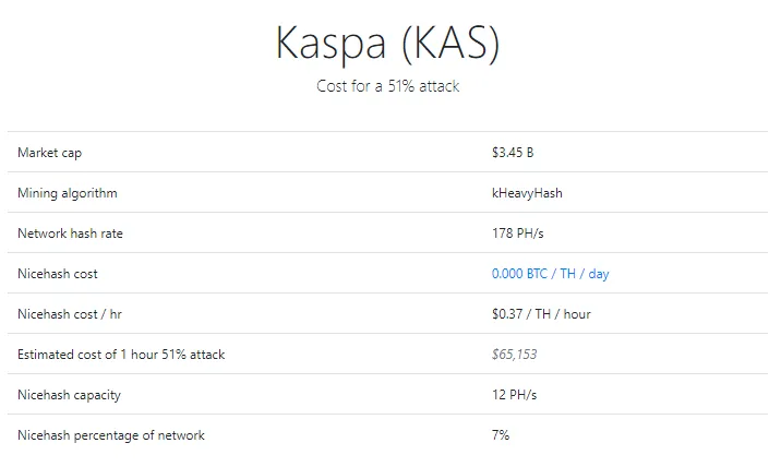 ในทางตรงกันข้าม ต้นทุนในการโจมตี Kaspa จะขึ้นอยู่กับราคาเช่าตลาดสำหรับการเช่า Hashing Power ซึ่งเป็นวิธีที่ง่ายที่สุด แต่จะขึ้นอยู่กับบริการของบริษัทภายนอก และไม่คำนึงถึงกำลังไฟทั้งหมดของฮาร์ดแวร์หรือค่าใช้จ่ายเพิ่มเติมใดๆ ในการใช้งาน