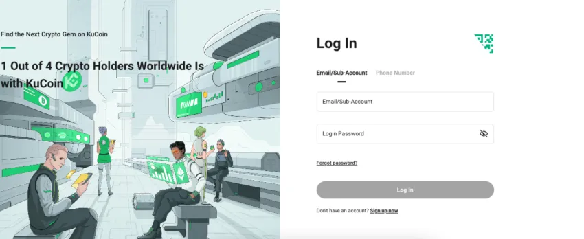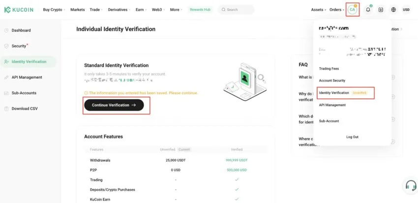 1. ล็อกอินเข้าสู่บัญชี KuCoin ของคุณ: เปิดเว็บไซต์ KuCoin หรือแอปมือถือแล้วล็อกอินเข้าสู่บัญชีของคุณ หากคุณไม่มีบัญชี คุณต้องทำการสมัครบัญชีและยืนยันตัวตนผ่านกระบวนการ KYC (Know Your Customer) เสียก่อน (ดูตัวอย่างด้านบน)