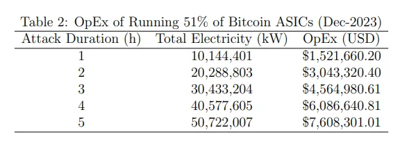 ในการวิเคราะห์ของเรา การคำนวณต้นทุนในการโจมตี Bitcoin จะมุ่งเน้นไปที่ต้นทุนในการดำเนินงานโดยตรง ซึ่งโดยส่วนใหญ่แล้วจะเป็นค่าไฟฟ้า ซึ่งก็จะขึ้นอยู่กับความเป็นเจ้าของหรือการเข้าถึงฮาร์ดแวร์การขุด จากเอกสาร “Breaking BFT: การหาปริมาณต้นทุนในการโจมตี Bitcoin และ Ethereum” ต้นทุนในการโจมตี (TCA) Bitcoin เป็นเวลา 1 ชั่วโมงจะอยู่ที่ประมาณ 7.6 พันล้านดอลลาร์