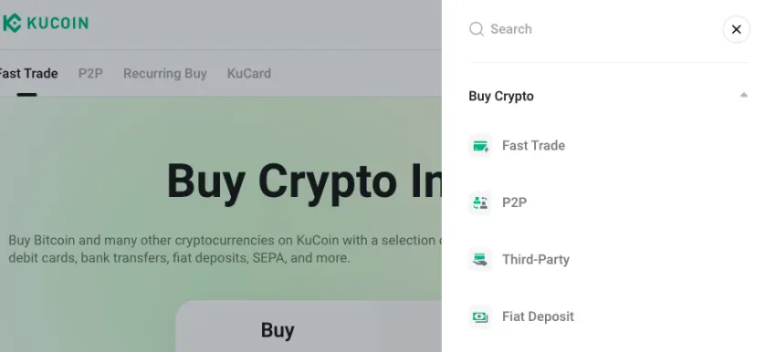 4. ไปที่ “Fast Trade”: ไปที่ส่วน “Buy Crypto” และเลือก “Fast Trade” เพื่อซื้ออย่างรวดเร็ว แล้วเลือกสกุลเงินเฟียตที่คุณต้องการใช้เพื่อซื้อ KAS