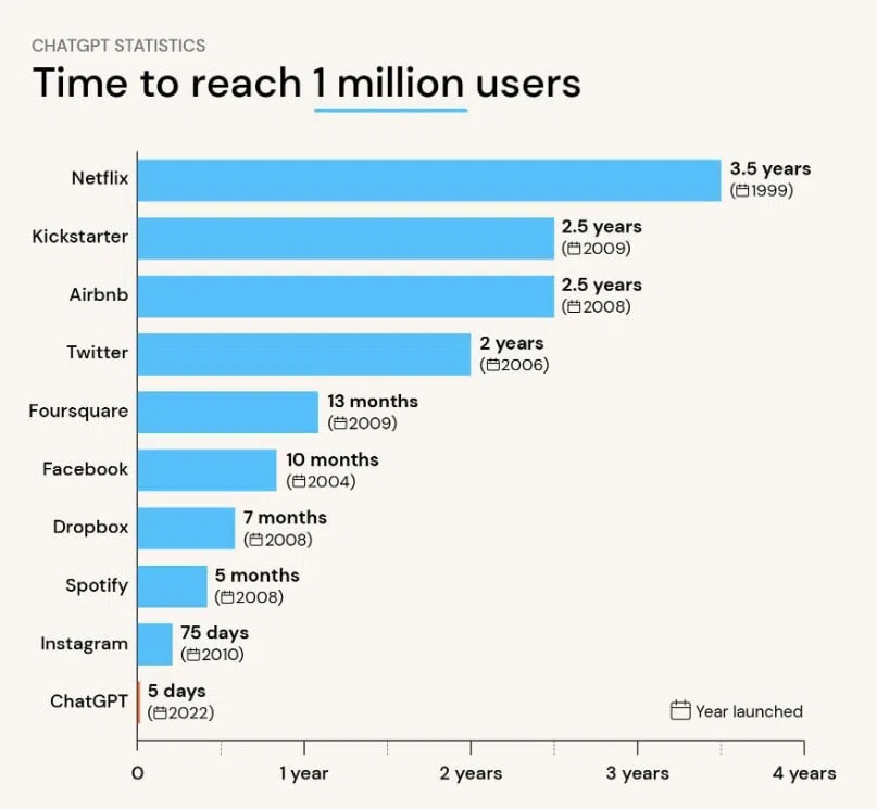ChatGPT แชทบอทที่ขับเคลื่อนโดย AI ซึ่งมีผู้ใช้งานถึง 1 ล้านคนภายในเวลาเพียง 5 วันแรกในช่วงที่มันเปิดตัวเป็นครั้งแรกในเดือนพฤศจิกายน 2022 ถือเป็นความสำเร็จที่น่าทึ่งเป็นอย่างมาก โดยเฉพาะอย่างยิ่ง เมื่อเปรียบเทียบกับแพลตฟอร์มชั้นนำอื่นๆ เช่น Netflix และ Twitter