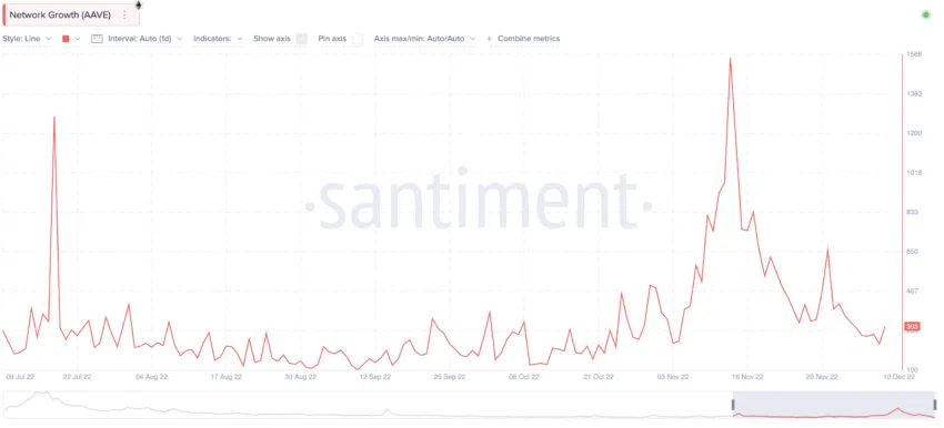 อีกหนึ่งข้อมูลบนเครือข่ายที่น่าสนใจก็คือการเติบโตของเครือข่ายรายวัน หลังการล่มสลายของ FTX กิจกรรมเครือข่ายที่เกี่ยวข้องกับ Aave นั้นได้เพิ่มขึ้นอย่างต่อเนื่อง โดยจุดสูงสุดเกิดขึ้นประมาณวันที่ 13 พฤศจิกายน 2022 ถึงแม้ว่าแรงกระตุ้นของการเติบโตของเครือข่ายจะมอดลงเล็กน้อยท่ามกลางบรรยากาศของตลาดที่นิ่งเงียบ แต่ระดับในเดือนธันวาคม 2022 นั้นยังคงเรียกได้ว่าเป็นระดับที่สูง