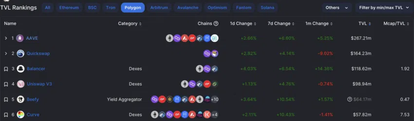 Aave บน Polygon เป็นโปรโตคอลอันดับต้นๆ โดยมี TVL อยู่ที่ 267.21 ล้านดอลลาร์ มูลค่าของ TVL เพิ่มขึ้นมากกว่า 5% ในช่วง 30 วันที่ผ่านมา