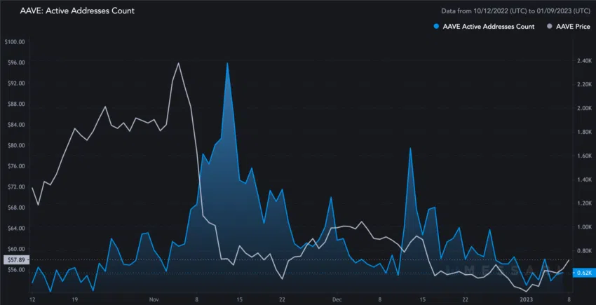 เมื่อดูจำนวน Active Address (ที่อยู่ของกระเป๋าเงินที่มีความเคลื่อนไหวในช่วงระยะเวลาที่กำหนด) ของ Aave ในช่วง 90 วันที่ผ่านมาก็จะเห็นได้ว่ามันลดลงอย่างต่อเนื่อง ราคาและจำนวน Active Address นั้นพุ่งสูงสุดในช่วงเดือนพฤศจิกายนและอีกครั้งในช่วงกลางเดือนธันวาคม แต่จนถึงปี 2023 ก็เริ่มนิ่งลงแล้ว สำหรับ Aave การเพิ่มขึ้นของ Active Address จะช่วยเพิ่มราคาของโทเค็นได้อย่างรวดเร็ว