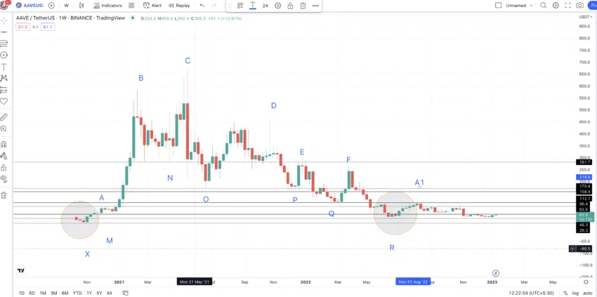 บริเวณที่ทำวงกลมไว้ทั้ง 2 ฝั่งอาจจะเป็นจุดเริ่มต้นและจุดสิ้นสุดของรูปแบบ ส่วนรูปแบบความเคลื่อนไหวนั้น AAVE สร้างจุดสูงที่สูงขึ้น 2 จุดเพื่อสร้างจุดสูงสุดที่จุด C จากจุดสูงสุด มันได้สร้างจุดสูงที่ต่ำลง 3 จุด ได้แก่จุด D, E และ F ตามลำดับ ไปจนถึงจุดต่ำสุดที่จุด R