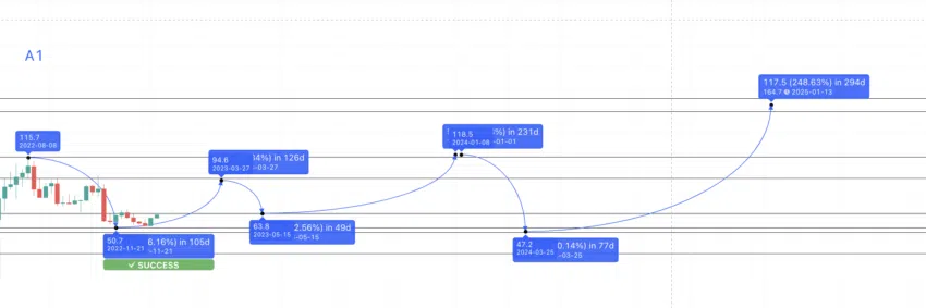ตอนนี้ เราได้จุดต่ำสุดของราคา AAVE ในปี 2023 แล้ว เมื่อใช้จุดต่ำสุดนี้ เราสามารถคำนวนหาจุดสูงสุดถัดไปในช่วง 126+ วันและเพิ่มขึ้นสูงสุดที่ 86.31% เรายังคงใช้ช่วงระยะเวลาสูงสุดและการเพิ่มขึ้นต่ำสุดในการคำนวนเนื่องจากการคาดการณ์ถึงสภาวะตลาด Crypto ที่อ่อนแอ