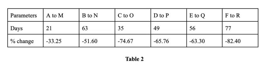 เมื่อได้จุดนั้นแล้ว เราสามารถใช้ค่าเฉลี่ยจากจุดต่ำไปสูงที่ 248.03% และระยะทางสูงสุด 126 วันเพื่อวางจุดถัดไปได้ (จุด B2) ต้องแจ้งให้ทราบว่าเราจะใช้ช่วงระยะเวลาสูงสุดในส่วนนี้ เนื่องจากลักษณะของตลาดขาลงของตลาด Crypto นอกจากนี้ ตลาดอาจจะยังคงอ่อนแอต่อไปในปี 2023 ดังนั้น การเพิ่มขึ้นของราคาสูงสุดอาจจะถูกจำกัดไว้ที่ 86.31% ซึ่งก็คืออัตราการเพิ่มขึ้นขั้นต่ำจากตารางข้อมูลชุดที่ 1