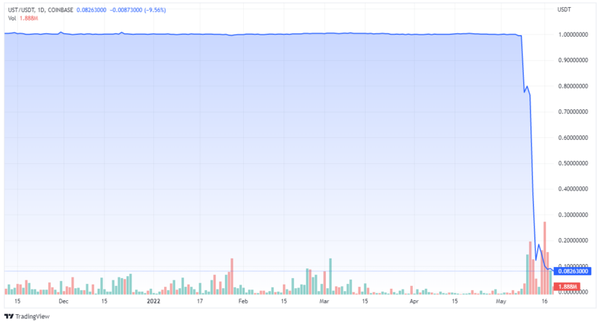อย่างไรก็ตาม TerraUSD (UST) กลายเป็นข่าวไปทั่วโลกเมื่อราคาลดลงและเข้าสู่เส้นตายในเดือนพฤษภาคม 2022 ผู้ก่อตั้งพยายามทำให้มันเกิดเสถียรภาพโดยการขายสินทรัพย์สำรองบางส่วน แต่อัลกอริธึมต่อต้านพวกเขา และอุปทานทั้งหมดของ LUNA ถึง 6.5 ล้านล้านในขณะที่นักลงทุนยังคงทิ้งโทเค็นเรื่อยๆ ดังนั้น มูลค่าของโทเค็น LUNA ลดลง 99.99% และมูลค่าของ UST ลดลงเหลือประมาณ $0.10 เหตุการณ์นี้เรียกว่า hyperinflation