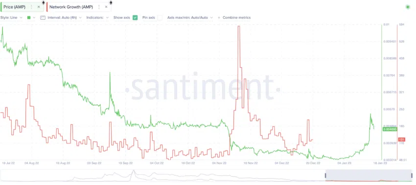 หากคุณดูที่ชาร์ตการเติบโตของเครือข่าย คุณสามารถเห็นจุดสูงสุดในวันที่ 13 พฤศจิกายน 2022 ได้อย่างชัดเจน นี่อาจจะเป็นเพราะความนิยมต่อ DeFi ที่เพิ่มขึ้นในช่วงที่ FTX ก่อให้เกิดปัญหาและความกังวลต่างๆ ซึ่งทำให้ผู้ใช้งาน Crypto ให้ความสนใจ Amp มากขึ้น ในเดือนธันวาคม 2022 การเติบโตของเครือข่ายนั้นค่อยๆ เพิ่มขึ้น สร้างจุดสูงสุดที่สูงขึ้น และในเดือนมกราคม 2022 ราคาของ AMP ก็เพิ่มขึ้นเกือบ 20%