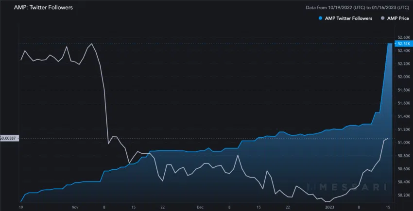 ในเรื่องของโซเชี่ยล — โดยเฉพาะ Twitter นั้น — ในไตรมาสที่ 4 ปี 2022 นั้นถือว่าดีมากๆ สำหรับ AMP ยอดผู้ติดตามใน Twitter เพิ่มขึ้นและราคาก็เช่นกัน ดังนั้น การจับตาดูยอดผู้ติดตามบนโซเชี่ยลมีเดียของ Amp นั้นอาจจะเป็นวิธีการที่ดีที่จะคาดการณ์เรื่องความเคลื่อนไหวของราคา