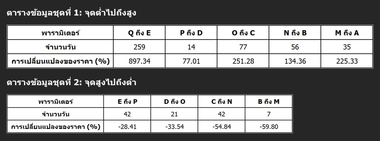 ค่าเฉลี่ยช่วงระยะเวลาและการลดลงของราคาจากจุดสูงไปต่ำนั้นจะอยู่ที่ 28 วันและลดลง -44.147% ช่วงระยะเวลาสูงสุดจะอยู่ที่ 42 วันและราคาลดลงต่ำสุดที่ 28.41% จากตารางข้อมูลชุดที่ 2