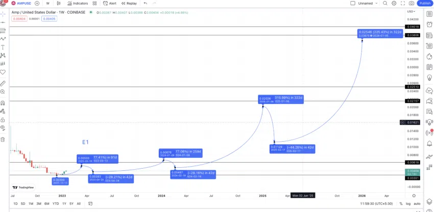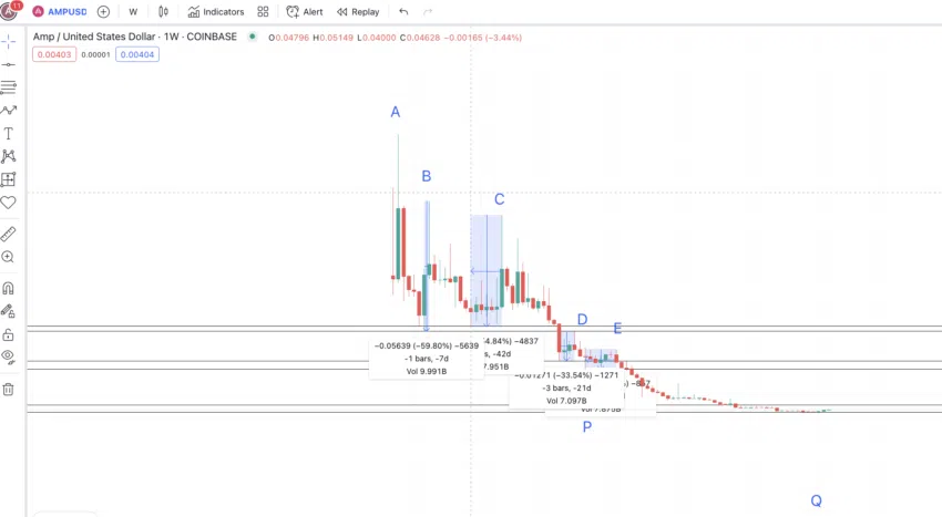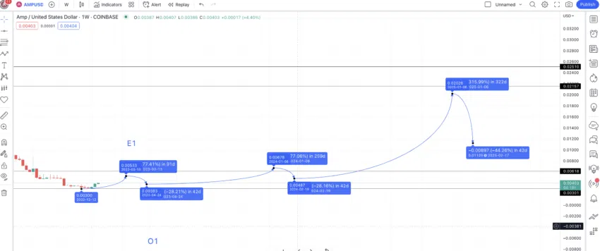 ดังนั้น มันแสดงให้เห็นว่าการลดลงจากจุดนี้ (จุด E1) เราสามารถใช้ช่วงระยะเวลาสูงสุดที่ 42 วันและลดลงเพียง 28.41% ได้เนื่องจากราคาของ AMP นั้นอยู่ในสภาวะที่แข็งแกร่ง ทำให้การคาดการณ์จุดต่ำสุดของปี 2023 อยู่ที่ 0.00383 ดอลลาร์