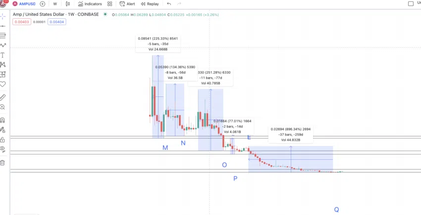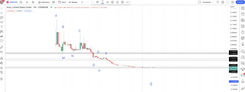 ชาร์ตรายวันของ AMP แสดงให้เห็นถึงศักยภาพที่จะวิ่งขึ้นไปถึง 0.00618 ดอลลาร์ หากราคาของ AMP สามารถขึ้นไปถึงโซนดังกล่าวได้ เราก็จะถือว่ามันเป็นจุดสูงใหม่ที่จะปรากฏบนชาร์ตรายสัปดาห์