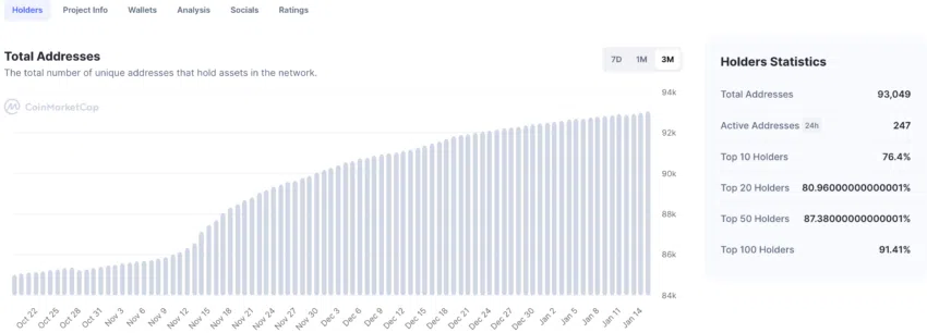 สัญญาณในเชิงบวกอีกอย่างคือการเพิ่มขึ้นอย่างต่อเนื่องของจำนวน Unique Address (จำนวนของที่อยู่ของกระเป๋าเงินที่ไม่ซ้ำกันที่ถือครองโทเค็น) ที่ถือโทเค็น AMP ในขณะที่สิ่งนี้จะเป็นผลในเชิงบวกต่อความเคลื่อนไหวของราคา แต่สิ่งที่น่ากังวลก็คือผู้ถือครองโทเค็น AMP ใน 100 อันดับแรกถือครองมากกว่า 91% ของสินทรัพย์ทั้งหมด