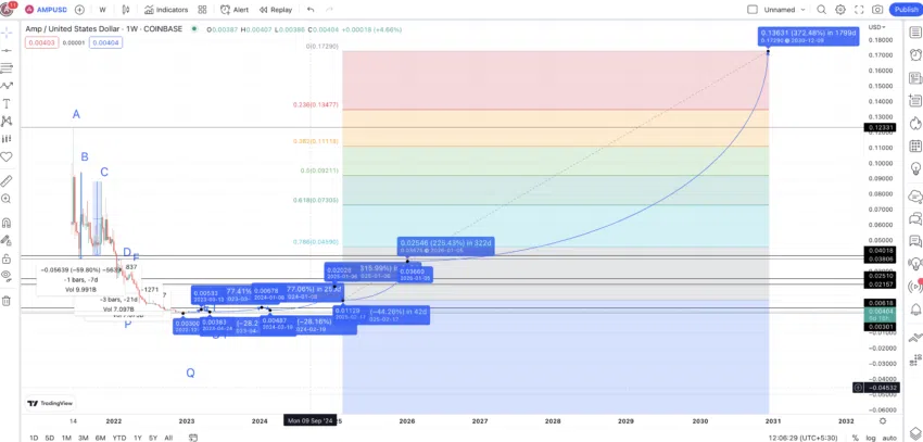 จากจุด O1 การเพิ่มขึ้นขั้นต่ำที่ 77.01% อาจจะใช้เวลาสูงสุดที่ 259 วัน สมมติฐานนี้ทำให้จุดสูงสุดในปี 2024 หรือจุด D1 นี้อยู่ที่ 0.00678 ดอลลาร์ จุดต่ำสุดถัดไปนั้นอาจจะลดลงเพียง 28.41% ในช่วง 42 วัน เนื่องจาก AMP นั้นมีแนวต้านที่กลายเป็นแนวรับที่แข็งแกร่ง 0.0047 ดอลลาร์ ดังนั้น จุดต่ำสุดของราคา AMP สำหรับปี 2024 นั้นอาจจะอยู่ที่ 0.00487 ดอลลาร์
