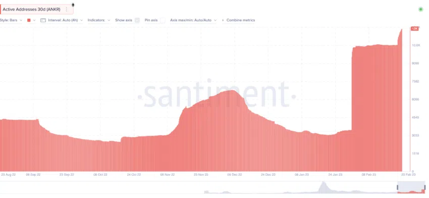 คงไม่ต้องพูดเลยว่าการเพิ่มขึ้นของ Active Address (ที่อยู่ของกระเป๋าเงินที่มีความเคลื่อนไหวในช่วงระยะเวลาที่กำหนด) สามารถผลักดันให้ราคาของโทเค็น ANKR ให้สูงขึ้นได้ กราฟด้านล่างแสดงให้เห็นถึงการเติบโตของ Active Address พร้อมกับช่วงที่ราคาขึ้นไปถึงจุดสูงสุดในเดือนกุมภาพันธ์ 2023