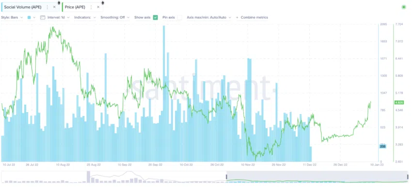ชาร์ตรายวันในระยะสั้นของ APE แสดงให้เห็นถึงราคาของโทเค็นที่พยายามจะทะลวงออกจากรูปแบบสามเหลี่ยมขาขึ้น อย่างไรก็ตาม การเพิ่มขึ้นของราคานั้นอาจจะดำเนินไปอย่างต่อเนื่อง เนื่องจากเส้นค่าเฉลี่ยเคลื่อนที่ 50 วัน (เส้นสีเขียว) กำลังเข้าใกล้เส้นค่าเฉลี่ยเคลื่อนที่ 100 วัน (เส้นสีน้ำเงิน) หากเส้นสีเขียวตัดเหนือเส้นสีน้ำเงิน เราจะเห็นการพุ่งขึ้นของราคาขยายช่วงออกไปอีก
