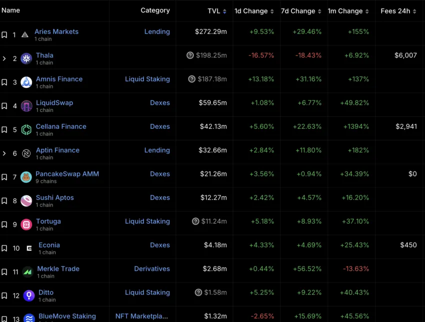 นอกเหนือจากตัวชี้วัดที่กล่าวถึงไปแล้ว การตรวจสอบสถานะของการเงินแบบกระจายอำนาจ (DeFi) ของ Aptos ก็เป็นสิ่งที่สำคัญ ในโลกที่ Ethereum และแพลตฟอร์มเลเยอร์ 2 มี TVL เป็นจำนวนมาก Aptos นั้นมีความก้าวหน้าเป็นอย่างมาก โดยอยู่ในอันดับที่ 15 ของ DeFi ที่มี TVL มากที่สุด