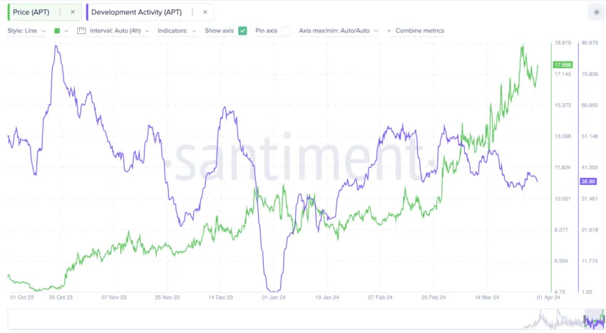 ในฐานะระบบนิเวศที่มีนักพัฒนาเป็นศูนย์กลาง กิจกรรมของนักพัฒนาที่เพิ่มขึ้นจึงเป็นหนึ่งในองค์ประกอบหรือตัวชี้วัดที่สำคัญที่สามารถใช้เพื่อคาดการณ์ราคาของ APT ในอนาคตได้