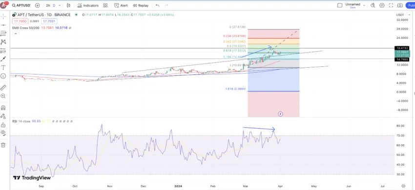 การปรับฐานอาจจะส่งผลให้ราคาของ APT ลดลงไปได้ถึง 14.8 ดอลลาร์ได้ แม้แต่ระดับ Fib Retracement ก็สอดคล้องกับเป้าหมายการเพิ่มขึ้นของราคาในระยะสั้นของเราที่ 19.4 ดอลลาร์
