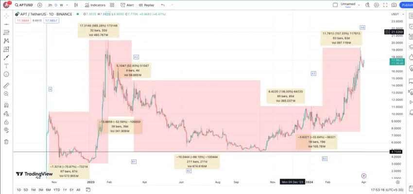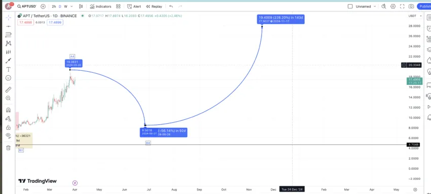 จุดสูงสุดสุดท้ายที่เราเห็นก็คือจุด A4 เราสามารถใช้ค่าเฉลี่ยการลดลงที่ -56.04% เพื่อค้นหาราคาต่ำสุดของ APT ในปี 2024 ซึ่งจะอยู่ที่ 8.50 ดอลลาร์ เราจะทำกำหนดให้จุดนี้เป็นจุด B4 ถึงแม้ว่าจะมีแนวโน้มของการลดลง แต่เราไม่คิดว่าราคาของ APT จะลดลงไปมาก เนื่องจากตลาดคริปโตในวงกว้างนั้นอยู่ในขาขึ้น แต่เนื่องจากตลาดสามารถเปลี่ยนแปลงได้อย่างรวดเร็ว เราจึงควรที่จะใช้ความระมัดระวังและคำนวนอย่างปลอดภัยไว้ก่อนจะดีกว่า