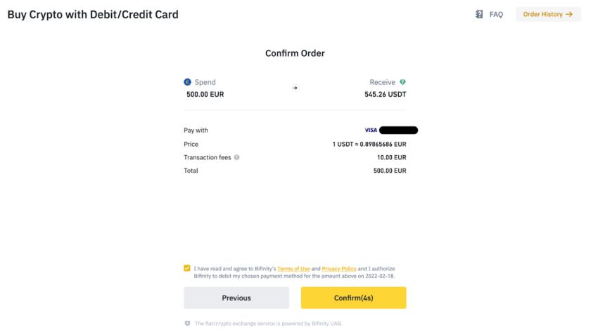 ที่นี่ คุณจะเห็นราคาที่แน่นอนต่อโทเค็น USDT ธุรกรรมที่เห็น และจำนวนเงินทั้งหมดที่คุณจะจ่าย หากคุณพอใจกับรายละเอียดทั้งหมด ให้คลิกที่ยืนยันก่อนที่ใบเสนอราคาจะหมดอายุ แล้วคุณจะทำธุรกรรมให้เสร็จสิ้น ควรใช้เวลาสักครู่เพื่อดูโทเค็นในบัญชีของคุณ คุณยังจะได้รับอีเมลยืนยันการสั่งซื้อของคุณอีกด้วย