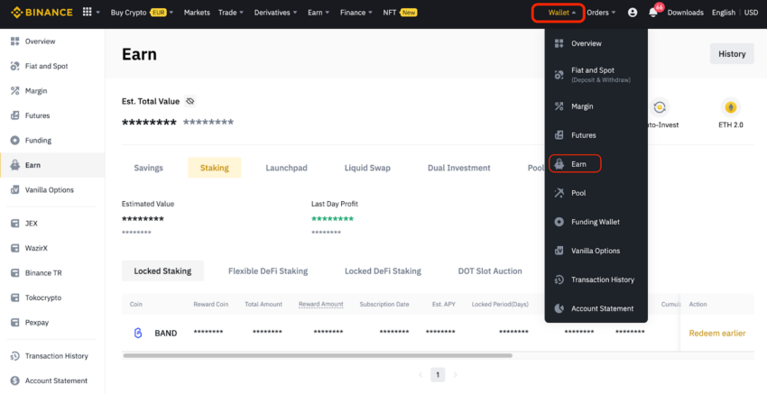 คุณสามารถดูการเดิมพันของคุณได้ในส่วน Wallet > Earn