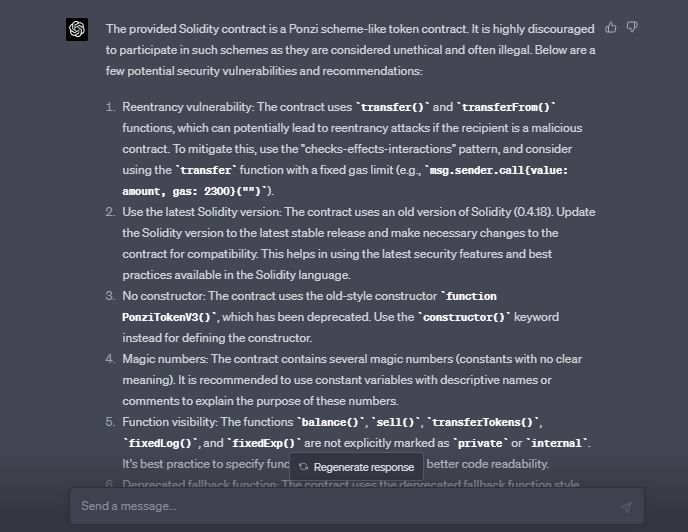 (ในตัวอย่างนี้ เราใช้สัญญาอัจฉริยะตัวนี้ ChatGPT ระบุสถานะของมันว่าเป็นแชร์ลูกโซ่ และระบุถึงปัญหาต่างๆ ที่พบในซอร์สโค้ด)