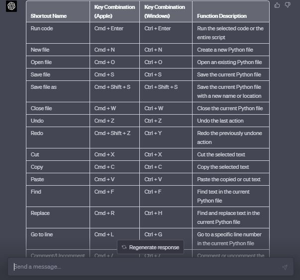 ฉันต้องการตารางรายการของ Python Shortcuts ที่ใช้กันโดยทั่วไปสำหรับทั้งอุปกรณ์ Apple และ Windows โปรดสร้างตารางที่ชัดเจนและเป็นระเบียบซึ่งมีชื่อ Shortcuts, ชุดคีย์ลัดของคำสั่งดังกล่าว, และคำอธิบายย่อ ๆ ของฟังก์ชั่นดังกล่าว