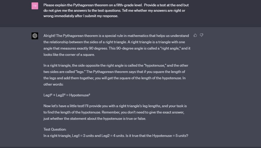 โปรดให้คำอธิบายเรื่อง “ทฤษฎีบทพีทาโกรัส” ในระดับชั้นประถมศึกษาปีที่ 5 พร้อมให้แบบทดสอบในตอนท้าย แต่ไม่ต้องให้คำตอบของแบบทดสอบเหล่านั้น ให้บอกฉันในทันที ว่าคำตอบของฉันถูกหรือผิด หลังจากที่ฉันส่งคำตอบไปแล้ว